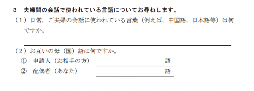 共通言語や連絡手段の確認を通じて夫婦の意思疎通の程度を調べたり、双方の家族構成の確認を通じて家族の関与度をチェックしたりする目的もあります。