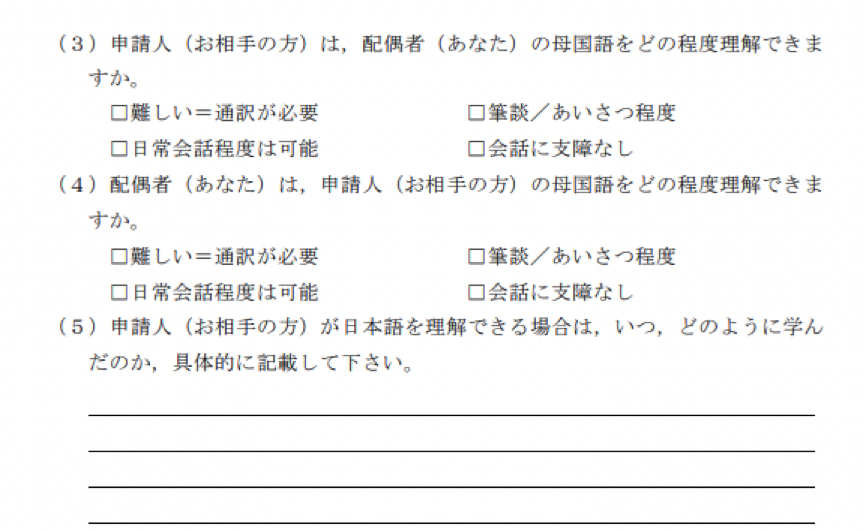 そこで、質問書3枚目の書き方は、紹介者の有無と夫婦間で使われている言語に分けて解説します。