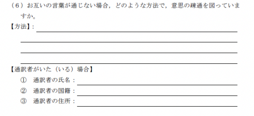 知り合った当初を含め、通訳者がいた場合は、通訳者の氏名や国籍、住所などを記入してください。いない場合、「通訳者はいません」などと記入します。