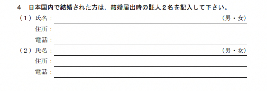 国際結婚の手続きを先に日本側で成立させた場合は、婚姻届に記入した証人2人の氏名と住所、電話番号を記入してください。