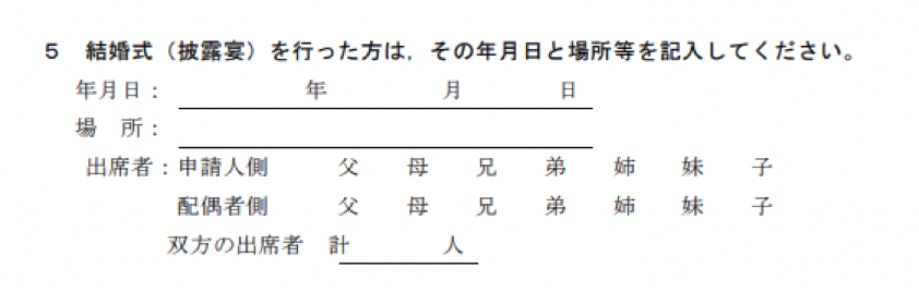 出席者については、該当する出席者を丸で囲みます。申請者側、配偶者側双方の出席者は概算で構いません。約30人や約50人など、おおよその人数を記入してください。