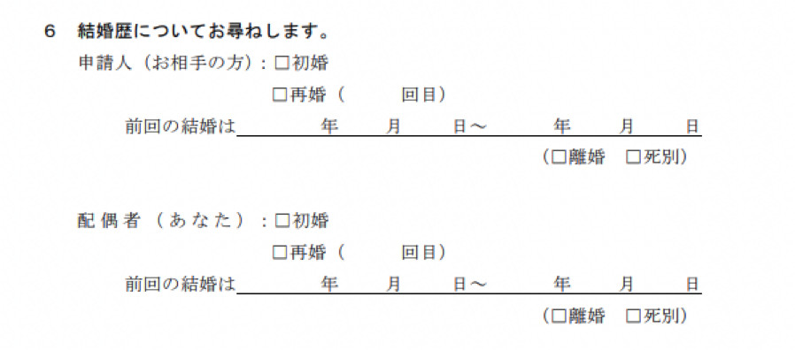 質問書5枚目は、結婚式を行った年月日と場所、結婚歴、申請人が来日した時期と回数で構成されています。