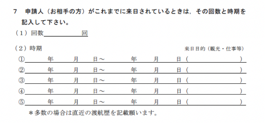 申請人が来日した回数や時期については、パスポートを確認しながら正確に記載してください。その際の来日目的の欄は「観光」「結婚手続き」「就労」など簡潔に記入します。