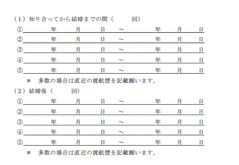 渡航歴は知り合ってから結婚までの間と結婚後の渡航回数と渡航時期について、パスポートを見ながら正確に記入してください。