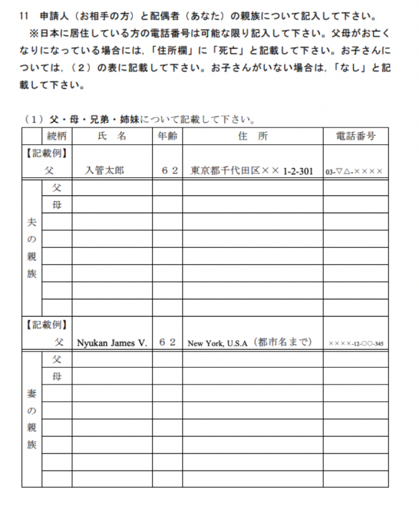 この欄では、申請人と日本人配偶者それぞれの親族の続柄や氏名、年齢、住所、電話番号を記入してください。