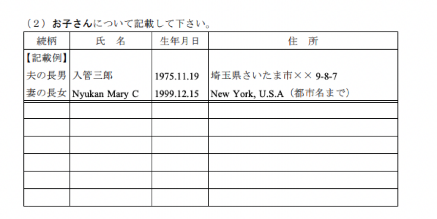 お子様の情報は記入例があるため、記入例に沿ってご夫婦の実子や、外国人配偶者および日本人配偶者の連れ子の情報を記入してください。