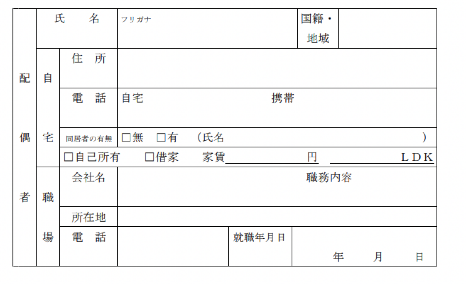 日本人配偶者の情報を記入する配偶者欄には、日本人配偶者の氏名や国籍・地域のほかに、自宅の住所や連絡先、職場の所在地や連絡先などを記入します。