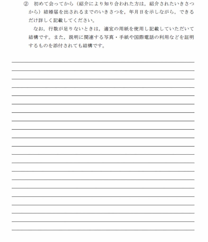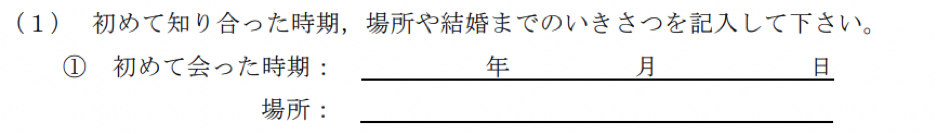 質問書の2枚目は、初めて知り合った時期や場所、結婚までの経緯で構成されています。