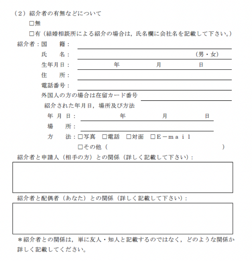 紹介者の情報は、国籍や氏名、生年月日、住所、電話番号のほかに、紹介者が外国人の場合は在留カード番号、紹介された年月日、場所・方法を記入する必要があります。紹介者が結婚相談所や結婚仲介会社の場合は、会社名を記入しましょう。